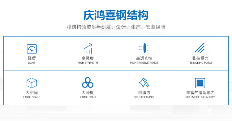 ????????安徽省慶鴻喜鋼結構有限公司是一家專業從事膜結構工程的綜合性公司。公司秉承“信譽第一、質量第一”的宗旨。開拓、發展、創新的理念。目前公司主營膜結構設計、膜裁剪設計、膜材加工及鋼結構安裝與維修。公司擁有一批國內較早從事膜結構行業的高素質技術人員和安裝隊伍,擁有先進的鋼膜設計軟件3D3S、forten32、和FSCAD,在設計上大膽創新,在加工上精益求精,在施工上安全認證,在售后上讓客戶使用放心。